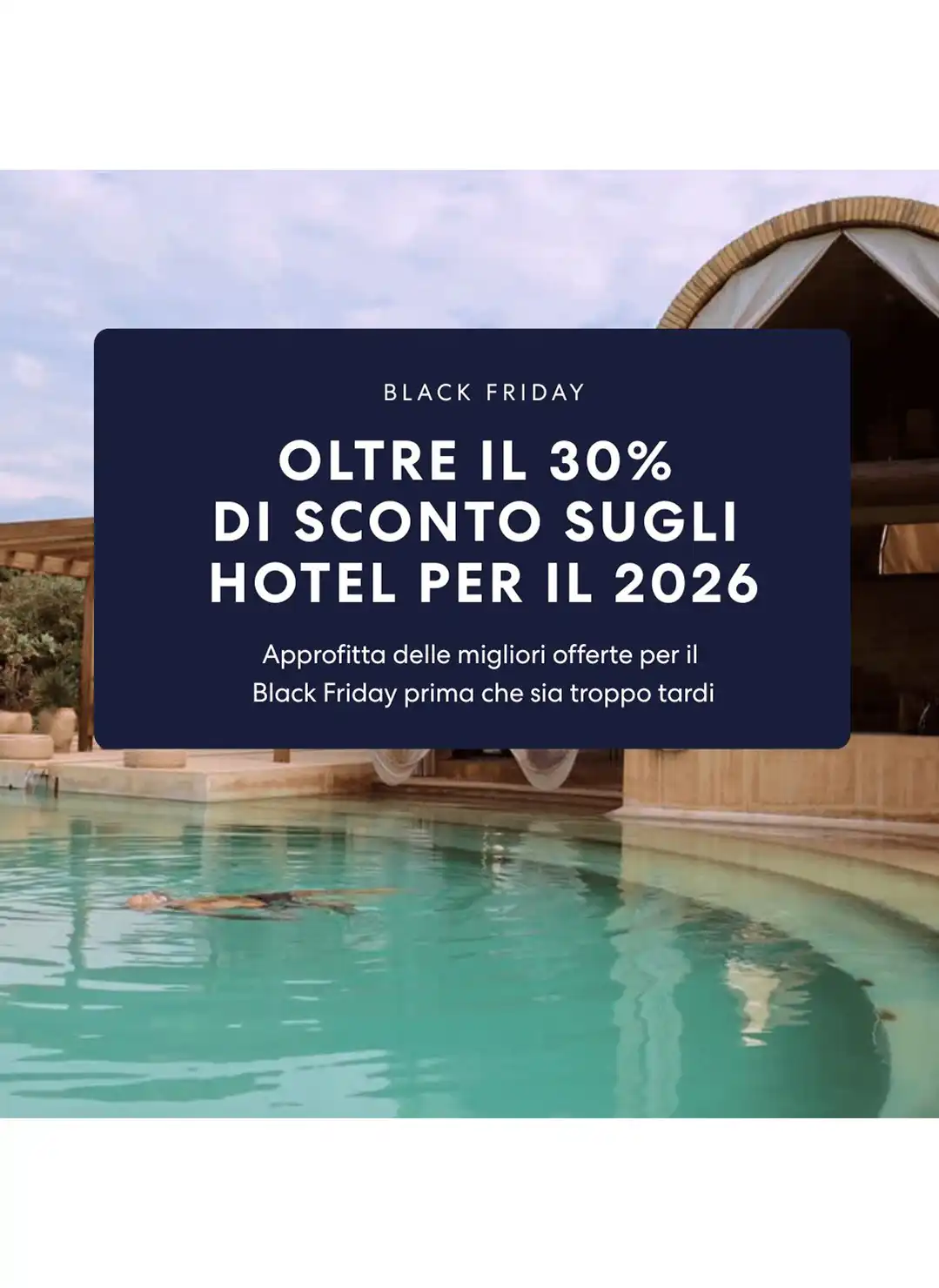 Per il 2025 ti offriamo un imperdibile sconto del 30%+ su migliaia degli hotel più richiesti in tutto il mondo. Inoltre, questi sconti sono validi per viaggiare fino a dicembre 2026. È il nostro intervallo di viaggio più lungo di sempre, pensato per dare ai tuoi viaggiatori più scelta e più flessibilità per scoprire il mondo a modo loro, spendendo meno.