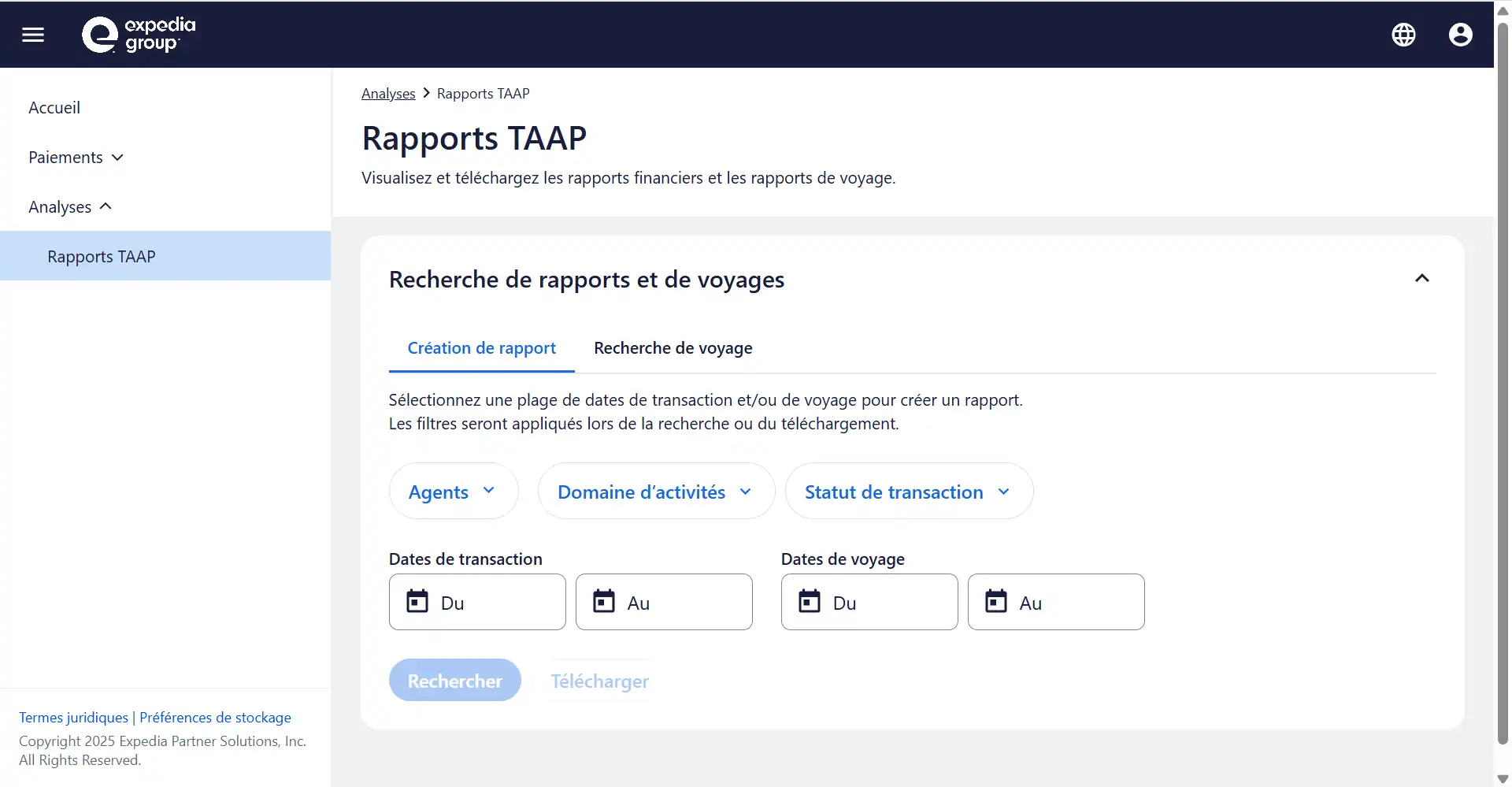 Créez des rapports avec de nouveaux filtres personnalisés : générez des rapports basés sur les dates de transaction ou de voyage, et affinez vos rapports en fonction des paramètres de votre choix.