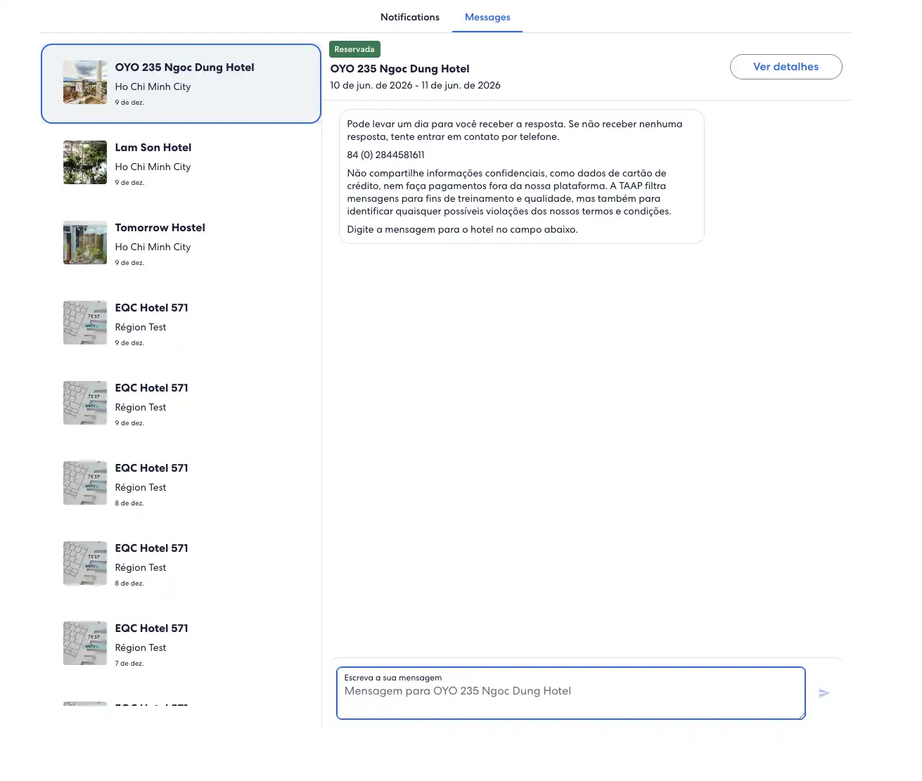 Uma nova aba será aberta com sua caixa de entrada de mensagens. Digite a mensagem para a propriedade e pressione Enviar.