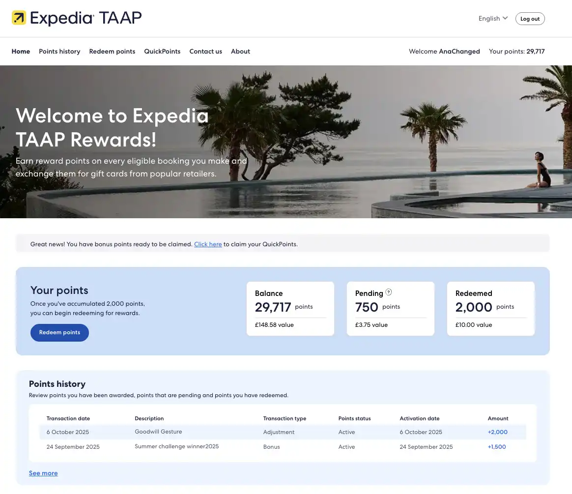 And that's it - you're now all set up to start earning reward points for every eligible booking on Expedia TAAP.
