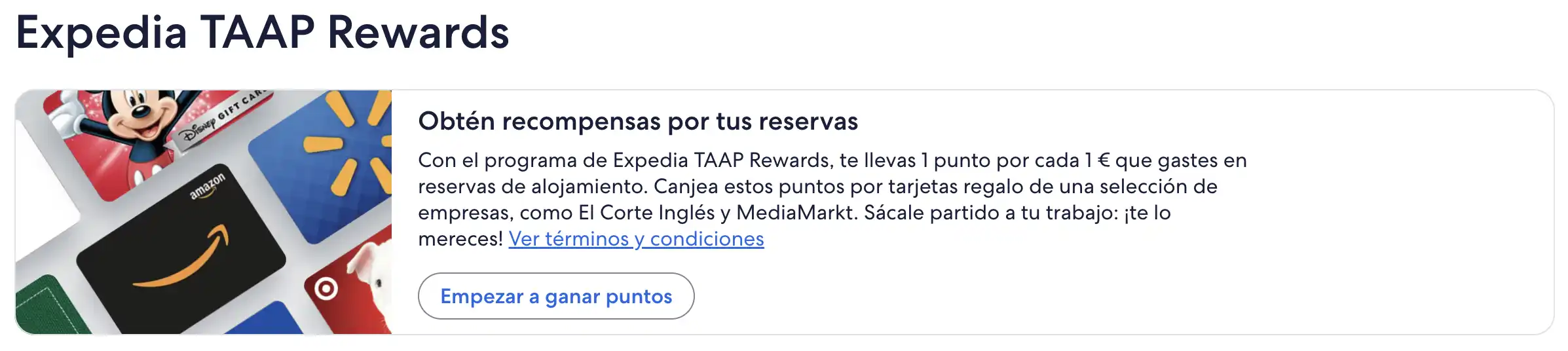 En la página de inicio de Expedia TAAP, desplázate hasta el báner de Expedia TAAP Rewards y haz clic en Empezar a ganar puntos para acceder al sitio web de fidelización.