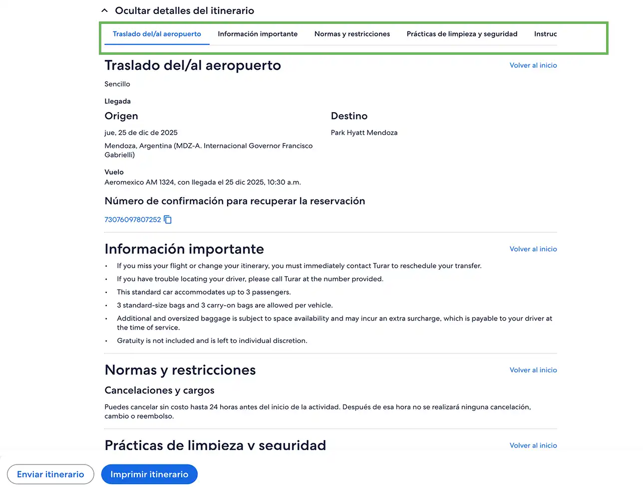 Puedes consultar los detalles de tu itinerario en cualquier momento desde la pestaña Mis viajes en la página de inicio. Los detalles importantes que debes tener en cuenta incluyen los puntos de entrega y devolución, las reglas y las restricciones aplicables, la información de contacto del proveedor, y más.